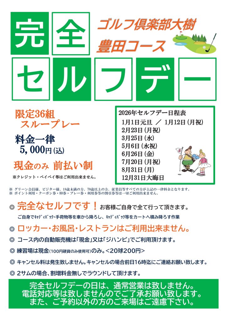 【ゴルフ倶楽部大樹豊田コース】完全セルフデーのお知らせ