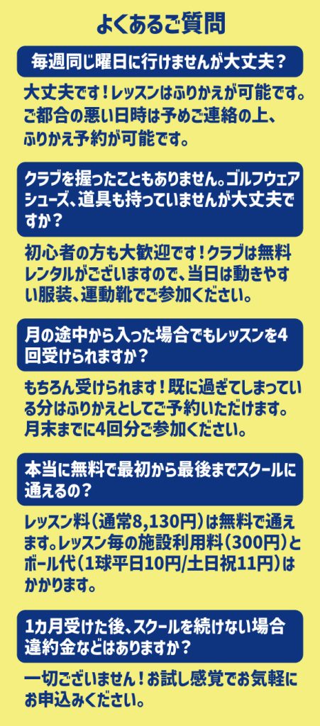 施設利用料(300円)とボール代(1球平日10円/土日祝11円)はレッスン毎にかかります。